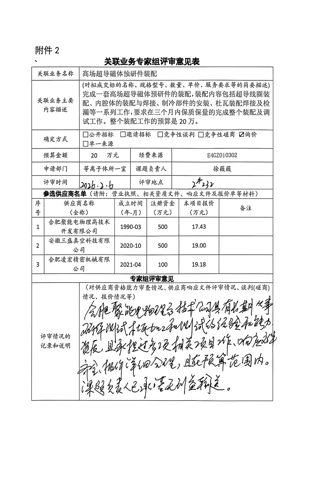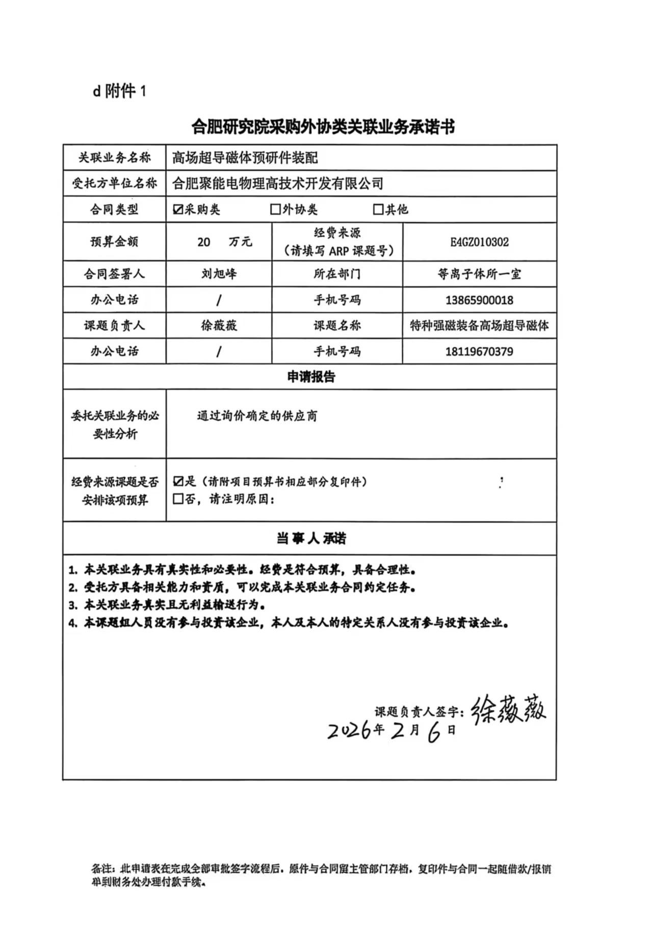 根据《中国科学院关于加强科研项目关联业务管理的暂行规定》(科发条财字〔2015〕125号)、《中国科学院合肥物质科学研究院关于加强科研项目关联业务管理的实施细则》(科合院发资字〔2021〕8号)、《合肥研究院加强关联业务管理暂行办法》(科合院发资字〔2022〕 1号)、《合肥物质院加强关联业务管理补充规定》(科合院发资字〔2025〕1号)要求,现就我院委托合肥聚能电物理高技术开发有限公司进行高场超导磁体预研件装配的关联业务做公示。