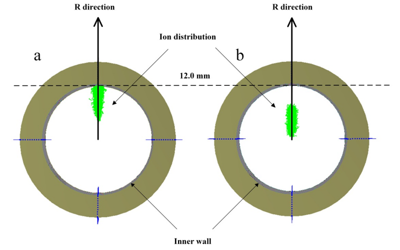 迁移管反应区离子分布模拟结果:未安装隔离网(左)和装有隔离网(右)