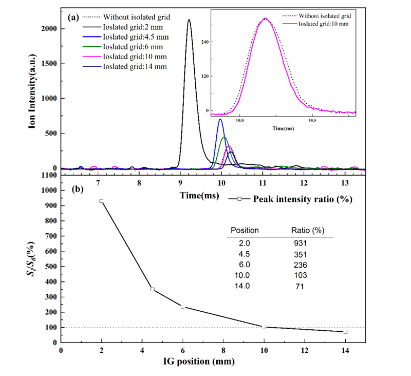 针对上述现象,研究团队提出了一种非均匀电场校正技术,在放电针下游设计了一种隔离网,以屏蔽和校正放电针产生的非均匀电场。理论模拟和实验结果表明,这种场校正技术能有效将离子聚焦在迁移管轴线上。当隔离网位于放电针下游2毫米时,离子信号强度是没有隔离网情况下的9.3倍;而当隔离网位于6毫米时,离子信号强度增加了2.36倍,分辨率提高了21%。