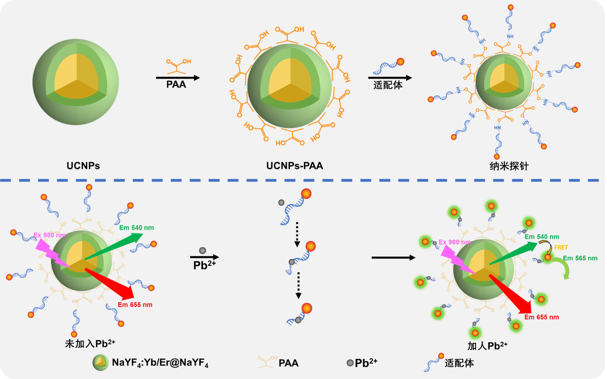 图1. 双信号反向变化上转换纳米探针设计及对Pb²⁺检测传感机制的示意图