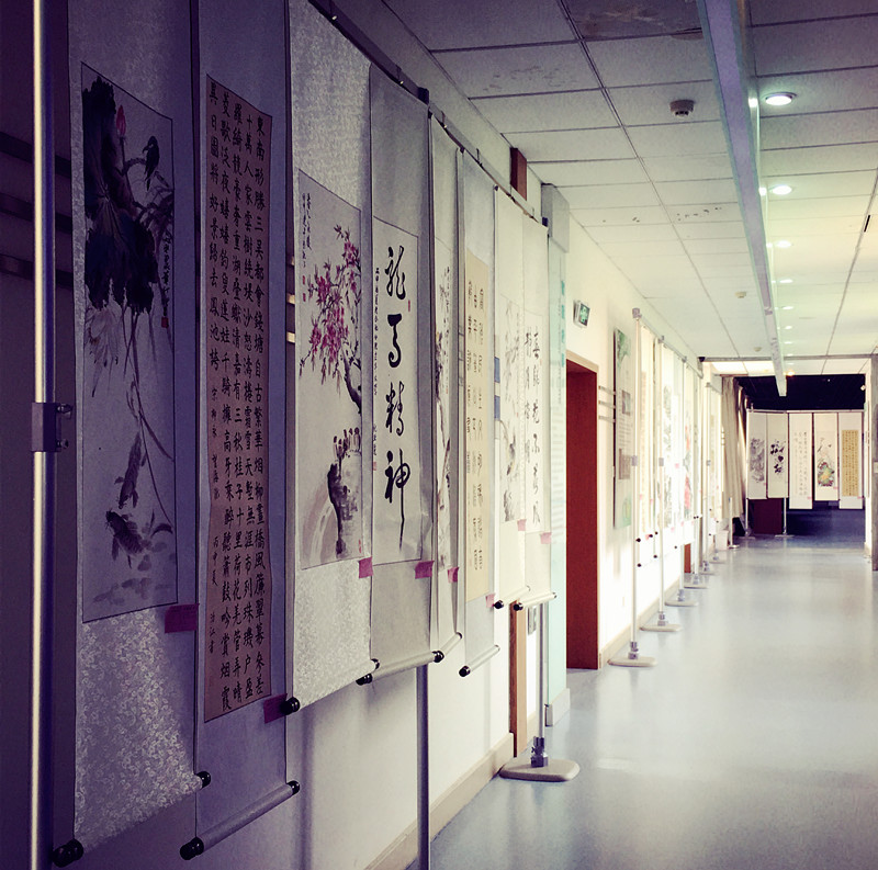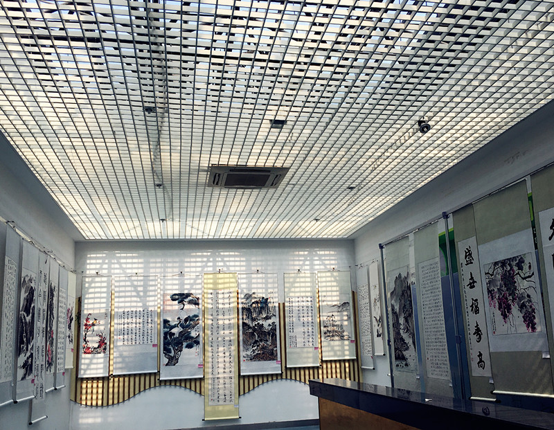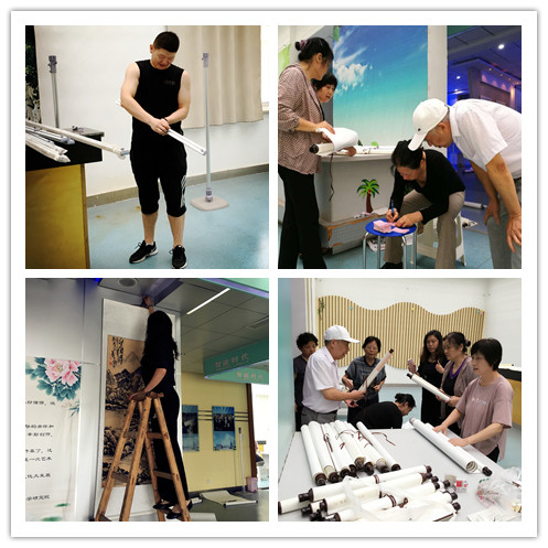 这是一次艺术的盛会,共有126幅精品力作参展。走进展览大厅,首先印入眼帘的是大幅遒劲的草书毛主席诗词《长征》,还有高远深邃的山水画《高山仰止》;那盛开的牡丹国色天香,苍松白鹤古意高洁,带来了一派祥瑞的祝福。一帧帧书法作品以真、草、隶、篆的形式,展现出“长征组歌”的万千姿态和“唐诗宋词”的无限意蕴。总参干休所的老干部裴德作了一首诗并挥毫写就,“卢沟烽火烟已沉,四周景物日月新。东邻妖气又乍起,莫忘桥身旧弾痕。”人们还在写意画和工笔画中感受到了生活的美好,高山流水如闻其声,花鸟鱼虫萌意天成,这正是“妙品抒盛世,新画颂国风”!大家流连往返,与作品合影,他们说还要组织更多的职工前来观赏。