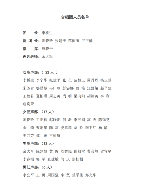 关于科学岛红枫艺术团成立合唱团名单的通知 发布时间:2023-05-30 作者: 【打印】 【小 中 大】 【关闭】 【关闭】 经前期面向物质院离退休声乐协会及老年大学声乐班、在职职工发布招聘团员考核通知后,科学岛红枫艺术团合唱团筹备考核组在5月21日分别在科学家园和梅园活动站完成招聘团员的考核工作。 经考核选拔结果审议后,科学岛红枫艺术团研究确定了合唱团的团长、副团长、指挥、声训老师及合唱团男女四个声部人员。(名单附后)。 科学岛红枫艺术团合唱团筹备组 2023年5月25日