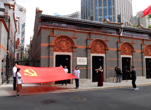 因为临近“七一”,“会址”和斜对面的“纪念馆”都在抓紧修缮和布置,暂不对外开放。尽管如此,热情的群众还是早早来此云集。“会址”门前的兴业路已经阻断了交通,车辆免进,成了步行街。群众就在会址门前奏乐、高唱“唱支山歌给党听”,挥舞党旗和国旗,表达了对党的衷心热爱。