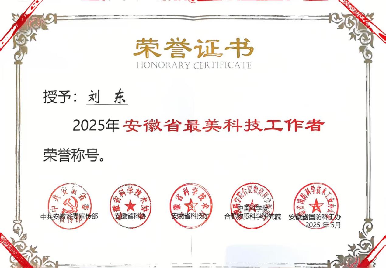5月26日,以“矢志创新发展 建设科技强国”为主题的2025年“全国科技工作者日”安徽省主场活动传来消息,中国科学院合肥物质院安光所刘东研究员获得“安徽省最美科技工作者”称号,并获颁荣誉证书。