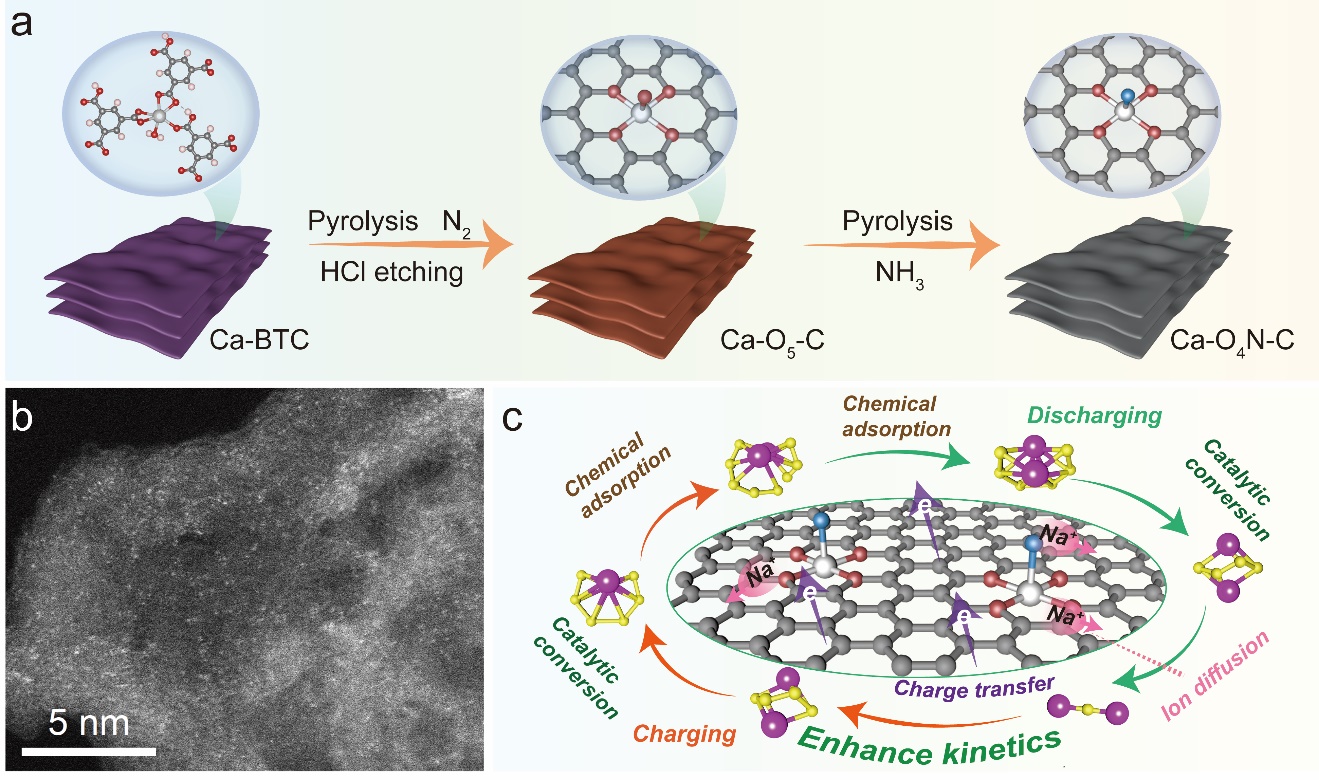 图1. Ca单原子催化剂的合成示意图、结构表征及钠硫电池反应机理图。