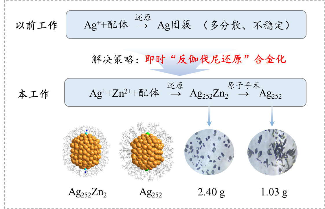 当金属纳米颗粒尺寸减小至临界尺度时,其电子结构会发生由连续能带的金属态向离散能级的分子态转变。揭示物质连续态向分子态转变的精准临界尺寸是纳米科技的一个核心问题,也是重大挑战,特别对于相对活泼的金属纳米粒子而言,存在稳定性差和多分散性等难题。合金化是一种有效的稳定化策略,研究团队早期提出的“反伽伐尼还原”(Angew. Chem. Int. Ed. 2012, 51, 2934-2938; 2018, 57, 4500-4504; 2020, 59, 3073-3077; 2025, 64, e202420931; J. Am. Chem. Soc. 2015, 137, 9511-9514; 2015, 137, 15350-15353; 2020, 142, 12140-12145; Acc. Chem. Res. 2018, 51, 2774-2783等)为合金化提供了一种不可替代的、方便的策略,但以往主要考虑对分离团簇实施“反伽伐尼还原”合金化,而溶液里即时生成、未加分离的金属团簇物种的“反伽伐尼还原”特性往往被科研人员忽视。
