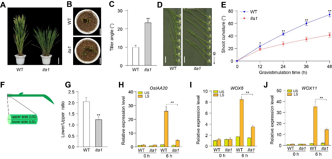 研究团队利用重离子束诱变技术筛选获得了一个分蘖角显著增大的水稻突变体ita1。通过图位克隆和遗传互补分析,发现该突变体中ITA1基因启动子区域发生740 bp缺失,导致ITA1表达显著上调,从而引起分蘖角增大(图1)。进一步遗传学与转基因实验表明,ITA1编码一个MYB家族转录因子,是水稻分蘖角形成的正调控因子。分子机制研究发现,ITA1通过直接激活BRXL4的表达,调控重力响应相关信号通路。已有研究表明,BRXL4可影响LAZY1的亚细胞定位,从而调控生长素的极性运输和不对称分布。团队通过生长素运输实验和重力响应分析发现,ita1突变体中生长素不对称分布受到破坏,导致向地性响应减弱,从而形成较大的分蘖角。此外,ITA1还影响多种生长素响应和发育相关基因(如 OsIAA20、WOX6和WOX11)的表达,进一步揭示了其在调控生长素信号与分蘖角形成中的关键作用。进一步研究表明,ITA1的上游调控因子为IDD家族转录因子LPA1。LPA1可直接结合ITA1启动子并抑制其表达,从而形成LPA1-ITA1-BRXL4级联调控模块(图2)。遗传分析显示,LPA1与ITA1在分蘖角调控中具有明确的上下游关系。