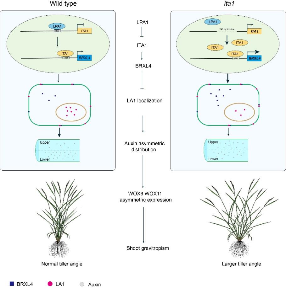 图2 LPA1-ITA1-BRXL4模块调控水稻分蘖角分子机制模型