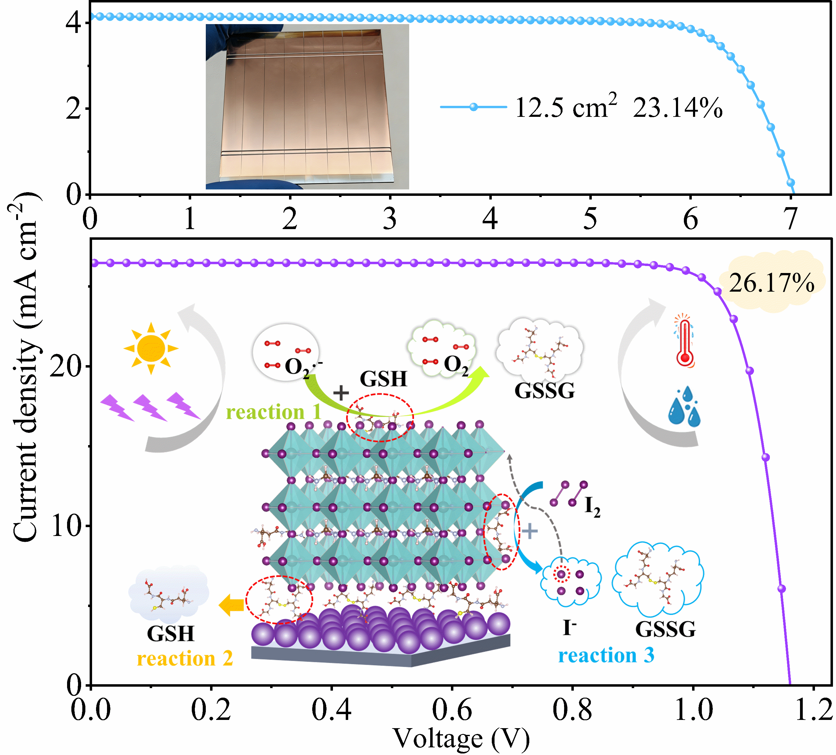 针对这一行业共性难题,研究团队将GSH作为多功能添加剂,构建“偶极子调控+氧化还原自修复”协同体系,实现从薄膜微结构到器件界面的跨尺度优化:通过界面偶极子工程与缺陷钝化,提升载流子分离与传输效率,降低非辐射复合损失;优化钙钛矿结晶动力学,制备出致密均匀、低缺陷的高质量薄膜,增强结构稳定性;构筑化学防护与氧化还原自修复机制,有效抵御外界环境侵蚀,显著提升器件长期稳定性。基于此,研究团队制备的小面积电池光电转换效率达到26.17%,微型组件(12.50 cm2)效率达23.14%,处于国际同面积组件先进水平。同时,器件在高温、高湿、光照及紫外等ISOS(国际有机光伏稳定性峰会)协议测试条件下,均表现出优异的稳定性,大幅优于传统器件,有效解决了效率-稳定性权衡难题。该研究提出的“动态调控+静态防护”理念,为高效稳定钙钛矿太阳能电池的开发提供了全新思路,对推动其规模化应用具有重要意义。