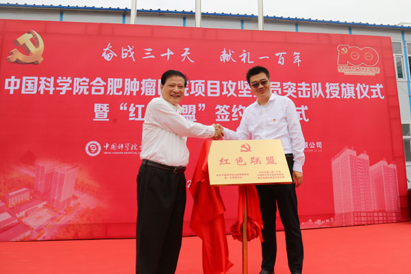 5月27日上午,中国科学院合肥肿瘤医院搬迁装修改造项目建设工地上,医院搬迁项目攻坚党员突击队授旗仪式暨党支部共建“红色联盟”揭牌仪式在这里隆重举行。党员突击队队长从中科院合肥研究院健康所党委书记,中国科学院合肥肿瘤医院党总支书记、院长王宏志手中庄严地接过队旗,并带领全体队员宣誓:坚决冲锋在先,确保安全、优质、高效完成项目建设,铸造精品医院工程。