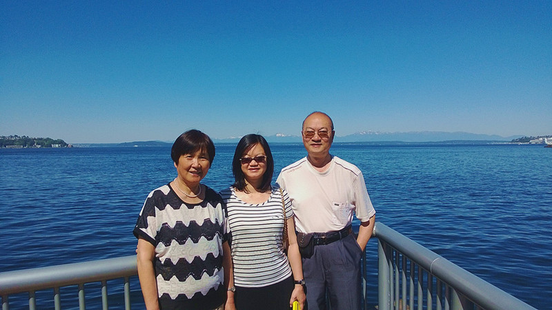 我和妻女在西雅图海边,对面有雪山