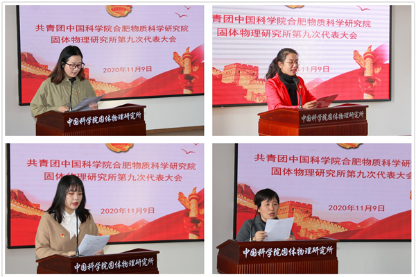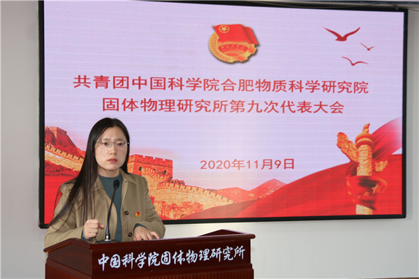在庄严的《国歌》声中,大会正式开始。固体所第八届团委书记姚洁向大会做工作报告。任期以来,所团委围绕科技创新这一中心,坚持党建带团建,扎实开展团的工作,如创新学习交流手段,带领团员青年加强政治理论,思想引领青年;打造“青年成长营”系列活动,紧密凝聚青年;组织团员青年参加“科学岛秋之约”等青年联谊活动,围绕需求服务青年;组织团员开展无偿献血、科普进校园等活动,激发青年社会责任感。所团委在工作体系建设、活动载体创新、青年典型选树等方面取得一系列成效,获得了中国科学院五四红旗团委,合肥研究院先进基层团组织,以及中国科学院优秀个人、安徽省优秀个人等表彰。