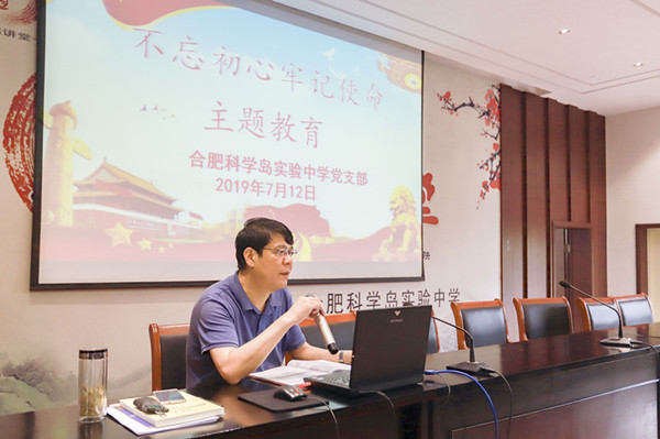 为进一步提高学校教职工党员党性修养和责任意识,坚定理想信念,进一步增强党员干部队伍和党组织的创造力、凝聚力、战斗力,7月12日,科学岛实验中学党支部开展了“不忘初心、牢记使命”主题教育活动,支部全体党员和入党积极分子参加,活动由学校党支部负责人、校长张国庆主持。