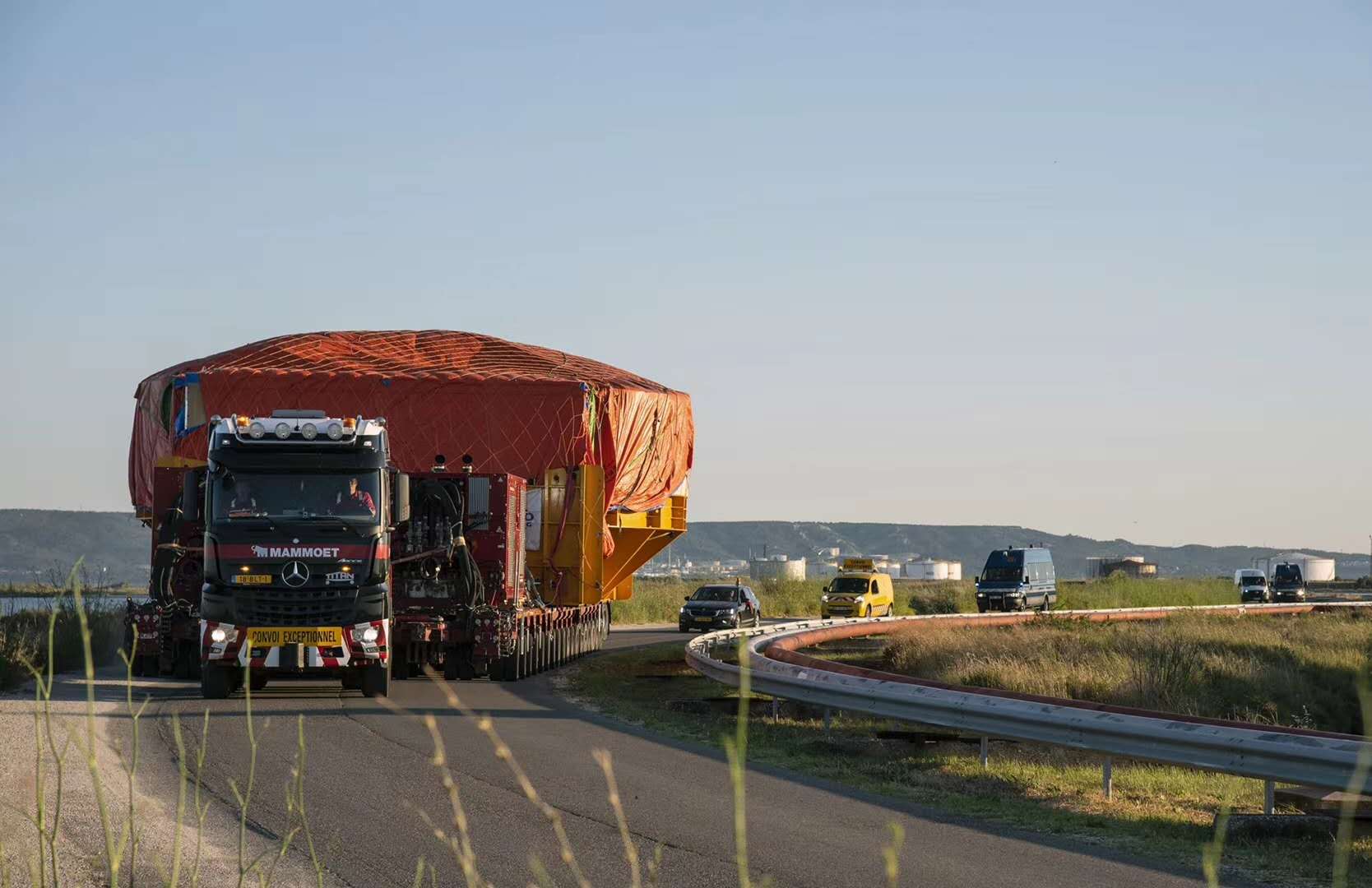 一辆有342个轮子的平板拖车拉着外径为达1.2米、重量达400吨的PF6线圈前往法国南部小镇卡达拉舍(ITER总装现场)