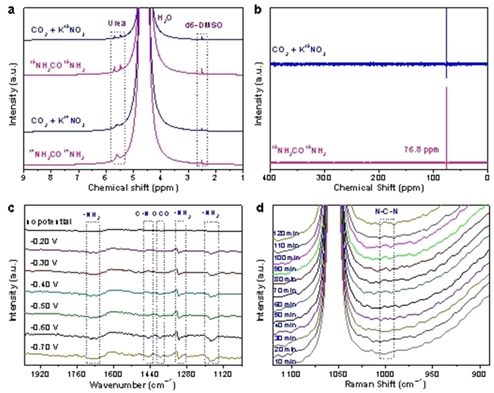 图1. (a) PdCu/CBC在-0.50 V (vs. RHE)最优电位下,使用K14NO3/K15NO3做电解液和标准物 (14NH2)2CO/(15NH2)2CO的1H NMR对比谱图; (b) PdCu/CBC在-0.50 V (vs. RHE)最优电位下,使用K15NO3做电解液和标准物 (15NH2)2CO的15N NMR对比谱图;(c) PdCu/CBC催化不同电位对应的原位同步辐射-红外光谱图;(d) PdCu/CBC在-0.50 V (vs. RHE)最优电位下不同反应时间对应的原位拉曼光谱图。