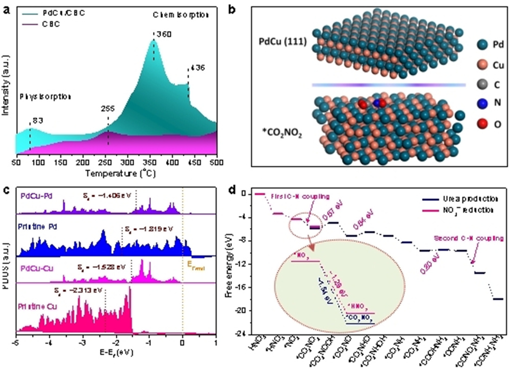 图2. (a) PdCu/CBC 和CBC样品的CO2-TPD图;(b) DFT计算优化的Pd-Cu合金 (111)晶面和中间体*CO2NO2结构图;(c) 双金属Pd-Cu、单金属Pd和单金属Cu的Pd-4d或Cu-3d轨道的态密度图,虚线表示Pd或Cu原子的d带中心,费米能级设置为0 eV;(d) DFT计算PdCu/CBC电催化合成尿素途径的吉布斯自由能图。