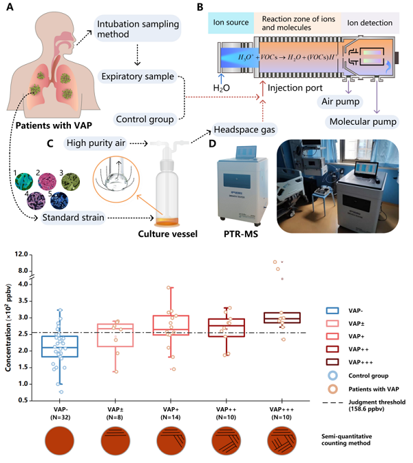 近日,中科院合肥研究院健康所医用光谱质谱团队利用自主研发的呼气质谱仪,基于气道深部呼气取样法,开展了ICU内呼吸机相关性肺炎(VAP)感染患者呼气中挥发性有机物的检测研究,发展出VAP无创筛查新方法。相关研究结果分别发表在期刊 Talanta 和 Analytical and Bioanalytical Chemistry 上。