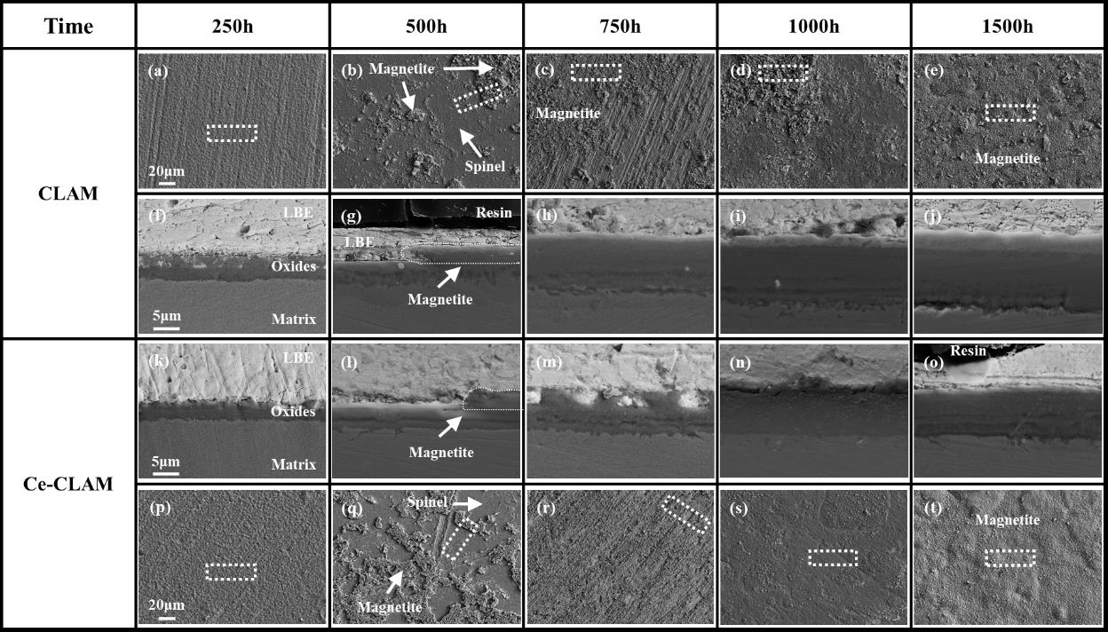 针对上述问题,研究人员开展了500℃、10-6wt%溶解氧浓度LBE环境下CLAM钢与Ce-CLAM钢样品腐蚀行为研究,结果显示:Ce主要存在于晶界处,有效降低了晶界上M23C6的数量,减少了晶界附近的贫Cr区域,增强了晶界的稳定性(图1);随着腐蚀时间的增加,两种样品表面氧化膜厚度均逐渐增大(图2),且Ce-CLAM样品氧化膜生长速率常数kp约为CLAM试样的1/2,表明微量Ce的添加改善了CLAM钢的耐LBE腐蚀性能;在此基础上提出了稀土元素Ce改善耐LBE腐蚀性能的机理模型(图3)。该研究可为铅冷快堆结构材料耐LBE腐蚀性能优化设计提供实验数据与理论参考。