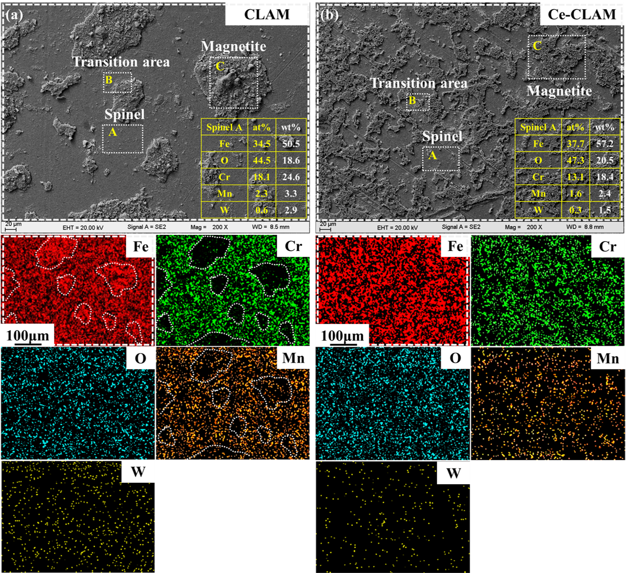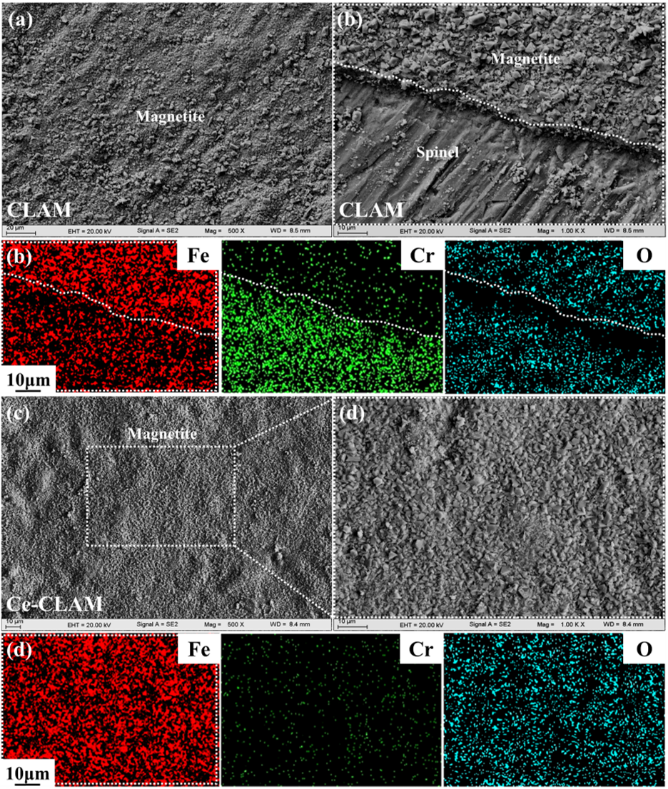 图2 腐蚀1500h后典型表面形貌与扫描结果(a-b)CLAM,(c-d)Ce-CLAM