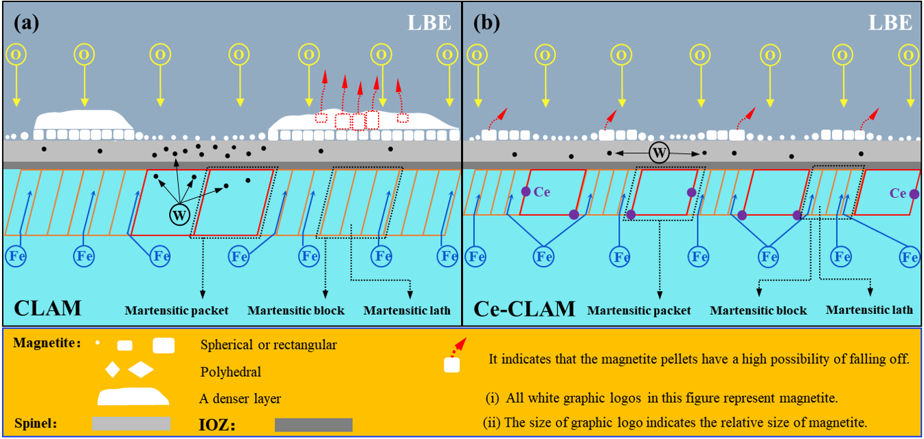针对上述问题,研究人员研究了高温LBE环境下铈(Ce)对中国低活化马氏体(CLAM)钢氧化膜演化的影响与作用机理。腐蚀试验结果显示:500h时,CLAM钢样品和Ce-CLAM钢样品分别产生了近似圆形、板条状的磁铁矿岛屿(图1);1500h时,CLAM样品氧化膜发生明显脱落,而Ce-CLAM仅发生局部脱落(图2)。与CLAM钢样品相比,Ce-CLAM钢样品的氧化膜显示出较好的连续性、完整性和粘附性。在此基础上提出了Ce影响磁铁矿形貌机理模型(图3)和氧化膜演化模型。这些可为铅冷快堆结构材料耐LBE腐蚀性能的深入研究提供一定实验数据与理论参考。