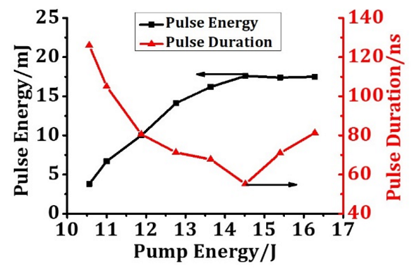 自主研制的2.79 μm Er,Cr:YSGG声光调Q激光器验证了所设计的铌酸锂声光Q开关具有良好的声光调Q性能 (图2),在50 Hz的高重复频率下得到了脉冲能量为17.6 mJ、脉冲宽度为55.2 ns、峰值功率为319 kW的激光输出,研制的Er,Cr:YSGG 铌酸锂声光调Q激光器能够实现稳定的、高峰值功率的激光输出。