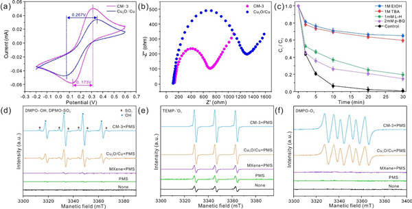 鉴于此,研究人员将MXene与铜氧化物Cu2O/Cu结合,成功构筑了具有纳米限域结构的新型催化剂Cu2O/Cu@MXene,并选择四环素作为降解目标,研究了Cu2O/Cu@MXene的催化降解性能。结果表明,在最佳降解条件下,四环素的去除效率在30 min内达到了99.14%,准一级动力学常数为0.1505 min-1,是Cu2O/Cu的3.2倍。这种出色的催化性能主要归因于Cu2O/Cu@MXene中的MXene能够促进四环素的吸附和Cu2O/Cu纳米颗粒之间的电子传输。EPR分析和猝灭实验表明,Cu2O/Cu@MXene/PMS体系中的主要活性氧物种是.OH。基于LC-MS监测到的降解中间体,研究人员提出了在这种非均相类芬顿体系中去除四环素的两种可能路径。该研究为设计环境友好、催化活性高的类芬顿催化剂提供了纳米约束构建策略,进一步拓宽了MXene在高级氧化领域的应用。