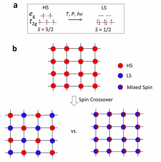 图1.格栅状金属-有机框架材料的自旋操控:(a)物理手段引起的Fe3+自旋转变;(b)格栅状晶格特定的自旋分布
