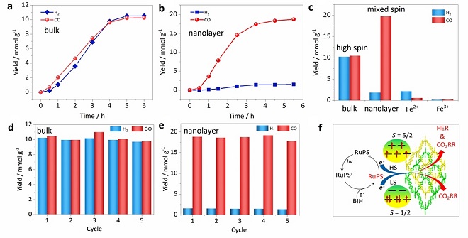图2. 催化性能:(a,b) 具有 (a) HS块材和 (b) MS纳米层o-1的随时间变化的H2和CO产率;(c) 照射4小时后,通过HS块材o-1、MS纳米层和对照样品作为催化剂产生的H2和CO;(d,e) 使用 (d) HS块材o-1和(e)MS纳米层o-1作为催化剂进行H2和CO生产的循环实验;(f) 光催化机理