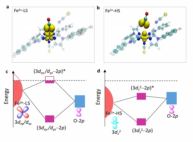 密度泛函理论(DFT)计算表明,低自旋3d轨道电子构型有效增加了O-2p和Fe-3dxy/dyz等成键轨道重叠(图3),从而显著促进CO2选择性吸附;然而,高自旋3d轨道是通过3dz2反键轨道与O-2p轨道发生重叠作用,大大减弱了催化剂与底物的成键相互作用,从而降低了催化活性。另外,DFT计算也表明,低自旋电子构型在降低活化势垒方面也发挥着关键作用。