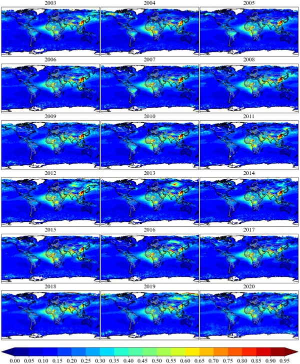 图1. 2003至2020年的年平均AOD550的空间分布