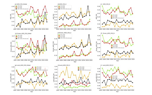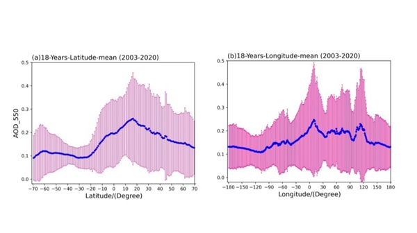 我国科学家分析了国际地球观测系统(EOS)中的TERRA和Aqua卫星上的中分辨率成像光谱仪(MODIS)探测的近20年AOD550数据,系统地获取了全球气溶胶光学厚度的全球分布和时空变化特性。