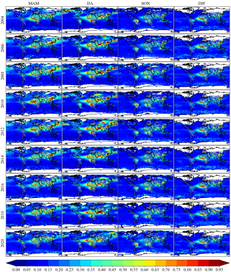 图4. 2004, 2006, 2008, 2010, 2012, 2014, 2016, 2018, 2020年的季节平均AOD550空间分布