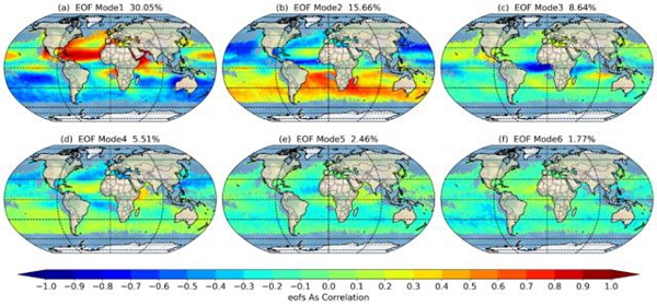 图6. 海洋上月平均AOD550的经验正交函数分析的前六个模式的空间分布