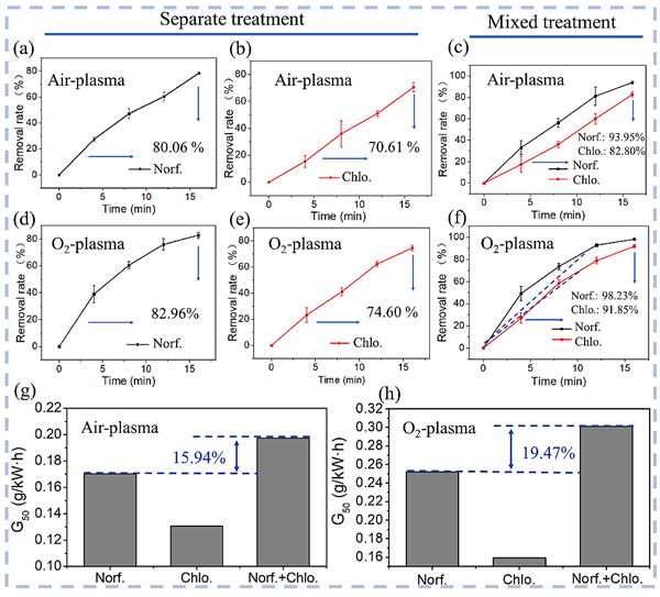 图2 利用低温等离子处理诺氟沙星和氯霉素混合物的降解效率的比较