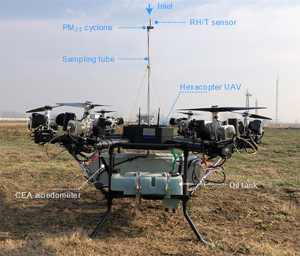 系统包含一架六旋翼油动无人机(载重40kg,续航超1小时)和一台小型化反照率光谱仪,并配备了微型黑碳仪、光学气溶胶探空仪和袖珍式紫外臭氧分析仪等多种辅助载荷和探头。系统已成功应用于2020-2021年寿县国家气候观象台气溶胶光学特性垂直综合观测实验,可为气溶胶与边界层相互作用、大气复合污染以及气候变化等研究提供重要、独特的测量方法和准确的观测数据。