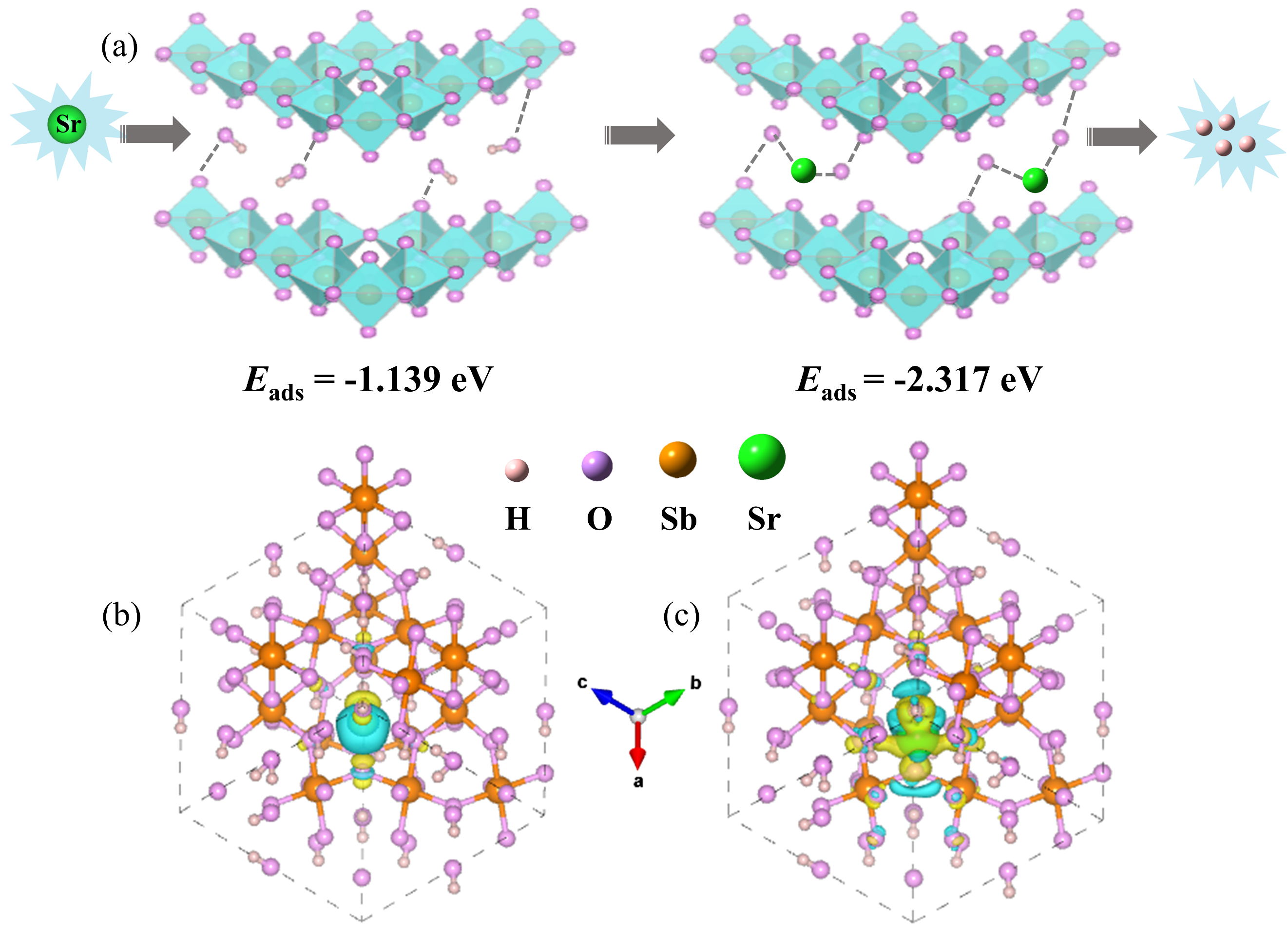 图2 (a) 吸附机理示意图和(b-c) 吸附锶前后Sb2O5/SiO2的差分电荷密度