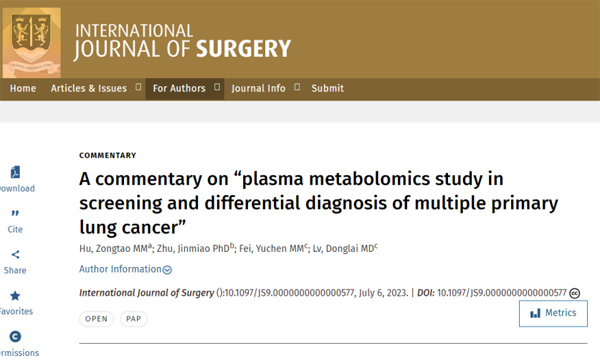 近日,中国科学院合肥肿瘤医院肺部肿瘤中心主任胡宗涛主任医师在国际知名医学期刊《国际外科学杂志》(International Journal of Surgery)的COMMENT & RESPONSE栏目中发表了题为《关于血浆代谢组学在多原发性肺癌筛查与鉴别诊断中应用的述评》的述评文章。