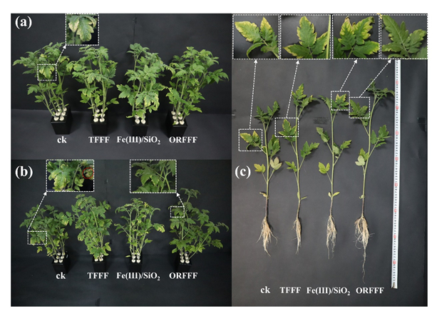 图 3. 喷施去离子水( CK)、传统肥料( TFFF)、硅基载体( Fe(III)/SiO2)和新型亚铁肥( ORFFF)溶液对缺铁番茄幼苗的矫正效果对比照片。( a)施肥前,( b)模拟两次雨水冲刷后,( c)收获时的数码照片。