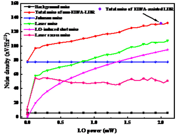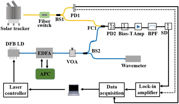 团队成员谈图副研究员和博士生李竣设计了一种基于掺铒光纤放大器EDFA的近红外激光外差光谱探测方案,利用具有功率饱和放大功能的EDFA将本振激光输出锁定在恒定功率上,通过优化本振光功率使外差辐射计在扫描过程中工作在散粒噪声主导的区域。实验测量了大气CO 2透过率谱,光谱信号的信噪比提高了3倍。研究结果表明,掺铒光纤放大器(EDFA)支持LHR消除基线斜率带来的误差,提高了激光外差辐射计的性能。
