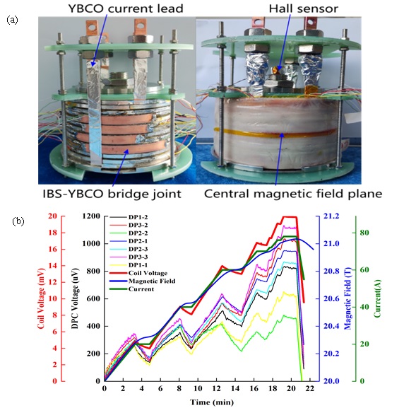 图注:(a)铁基超导高场内插线圈;(b)内插线圈在20T背景场下励磁实验结果