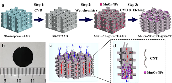 成本低廉的二氧化锡(SnO2)和四氧化三锰(Mn3O4)等过渡金属氧化物具有较高的理论比容量,是锂离子电池的理想负极材料之一。然而,这类材料的导电性差、在充放电过程中体积变化大,因此制约了其在锂离子电池中的应用。此前有研究通过纳米化以及与各种碳材料导电框架形成复合结构等措施,提高了过渡金属氧化物活性材料的导电性,并有效缓释了其体积膨胀。但在此过程中不可避免的使用了大量的导电剂、粘结剂、集流体等非活性组分,导致电极材料出现比能量密度低、离子传输通道受阻和功率密度低等问题。因此,设计构筑“一体化”集成的碳框架活性材料载体,对提升电极容量、倍率性能和稳定性等具有重要的理论意义和实际应用价值。