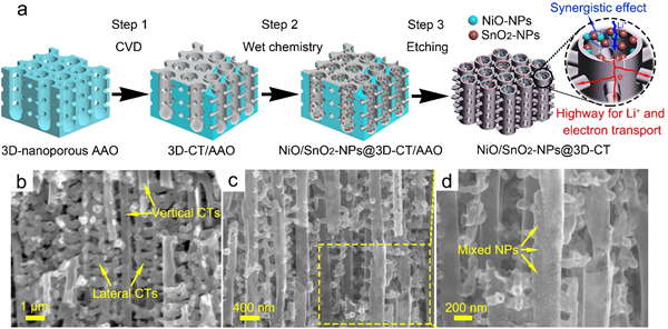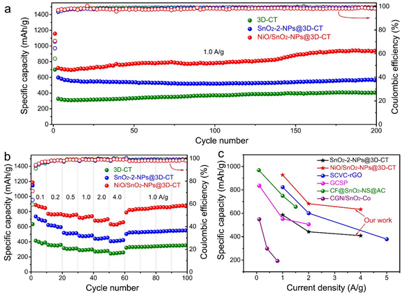 与此同时,科研人员还在三维碳管网格膜的碳管内壁同时负载了过渡金属氧化物NiO和SnO2纳米颗粒(图4)。这种新型负极具有如下优势:1、一体化碳管框架之间的化学键连接,不仅提高了电极的稳定性,而且减小了电极内部的接触电阻,提高了电极的导电性;2、有序直立的碳管阵列缩短了锂离子输运距离,加速了锂离子的快速输运,从而提升了电极的倍率性能;3、碳管内壁的NiO纳米颗粒不仅能够作为活性材料提升容量,还能与SnO2协同促进Sn向SnO2的可逆转化,极大地提升了电极的容量和倍率性能。结果表明,该复合电极在1 A g-1的电流密度下充-放电循环200次后,比容量达到928.5 mAh g-1,并且在4 A g-1的高电流密度下仍然具有633.5 mAh g-1的高比容量,展现了优异的容量和倍率性能(图5)。