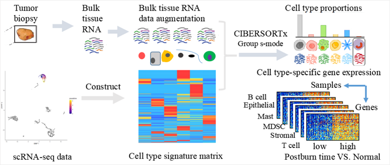 分析烧伤皮肤基因表达随时间变化过程对于适时治疗(therapeutic timing)至关重要。过去三十多年中,针对组织bulk转录组的基因表达谱分析为最常用的数据分析手段,但是该技术不能区分因为细胞类型数量和细胞类型特异性的基因表达变化等混淆因素的影响,仅能够判定所有细胞类型的平均基因表达变化。然而,皮肤组织的基因表达变化原因,既由细胞基因表达变化即细胞状态变化,也由细胞类型分数和数目变化所引起的综合结果。精确区分细胞分数和基因表达变化,挖掘烧伤后细胞和基因靶标,对促进临床伤口愈合具有重要意义。