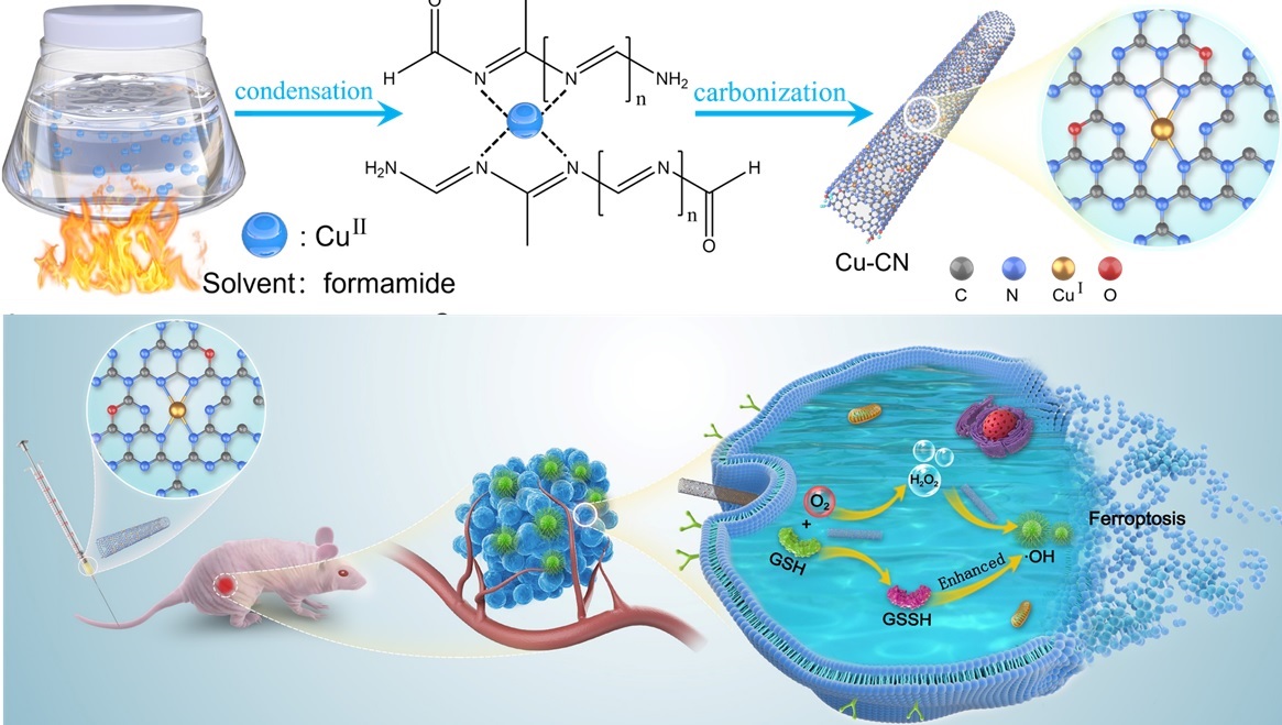 基于上述情况,联合研究团队提出了一种通过有机溶剂和Cu 盐的自碳化-还原来制备Cu SAEs的新策略。作为一种常规有机溶剂,甲酰胺由于其高氮含量和空位配体位点,易缩合成线性大分子链,从而螯合Cu 。在高温作用下,甲酰胺碳化生成的还原性物质将Cu 还原为Cu ,进而形成Cu 负载的氮化碳纳米线(Cu-CN)。结果表明:该Cu-CN具有2.19 atoms/nm2(23.36 wt.%)的超高单原子密度,展现优异的GSH消耗和 OH产生性能,诱导肿瘤细胞产生高效的铁死亡和凋亡,实现高达89.17%的肿瘤抑制率。该项研究为制备以氮化碳为载体的单原子催化剂提供了一种全新的策略。