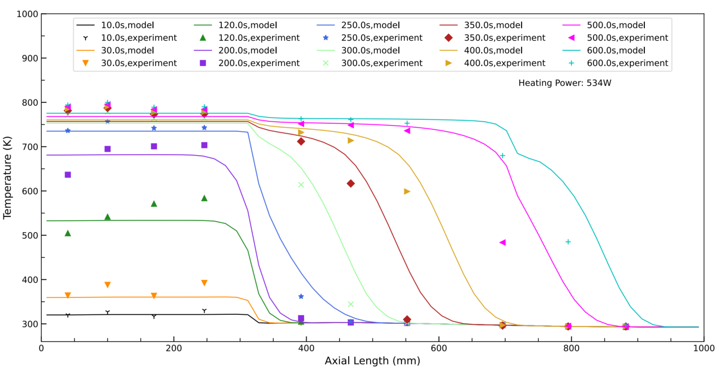高温热管是热管核反应堆的核心传热元件,其冷态启动特性影响热管堆的动态响应性能。余大利副研究员等人通过实验研究了高温热管在不同倾角、功率、冷凝条件等的冷态启动特性,揭示了高温热管工作温度、温差、启动时间等受功率的影响机制,并开发了基于可压缩流的冷态启动三阶段物理模型。研究结果表明,该模型能够在大功率范围下准确预测热管壁面温度分布和蒸汽前锋流位移。研究结果为热管堆的优化设计与自主运行提供物理模型基础。