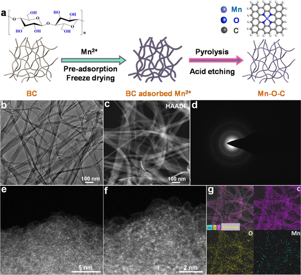 图1. (a) Mn-O-C的合成路径图;Mn-O-C样品的 (b) TEM图, (c) HADDF-TEM图, (d) SAED图, (e)球差校正的HADDF-STEM图和 (g) EDS元素分析图。