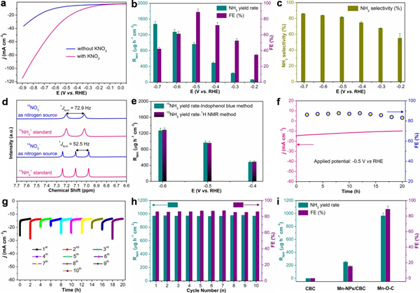 图2. (a)Mn-O-C样品分别在含有和不含有KNO3的Ar饱和的0.1 M K2SO4电解质中对应的线性扫描伏安曲线; (b)不同电位下对应的产氨速率和法拉第效率;(c)不同电位下的产氨选择性; (d) 最佳电位下分别以15NO3和14NO3和标样的1H NMR谱图; (e) 最佳电位下靛酚蓝和1H NMR两种方法定量检测氨速率对比图;(f)长时间NO3-RR测试;(g) 和 (h) 循环稳定性测试;(i) CBC,Mn-NPs/CBC 和Mn-O-C样品NO3-RR性能对比图。
