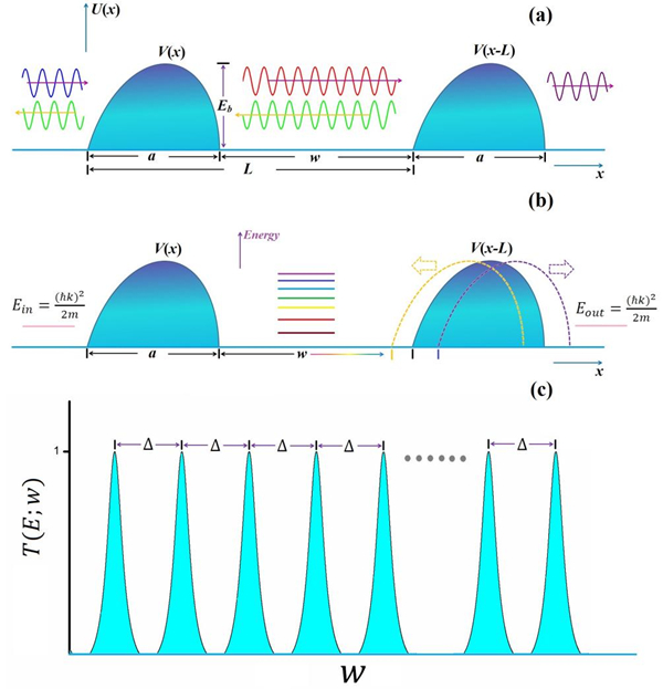 图 1. (a) 双势垒之间的量子干涉及隧穿现象; (b) 通过改变势垒间距调控共振能级; (c) 给定能量下的量子隧穿概率随势垒间距的分布。