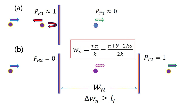 图 2. (a)微观粒子被单势垒几乎完全反射;(b)满足给定势垒间距的条件下,同样的微观粒子在双势垒之间发生共振隧穿。其中,势垒变化步长不小于普朗克长度 lP 。