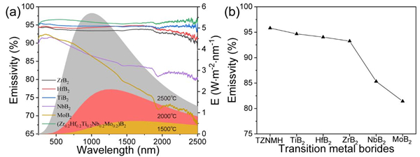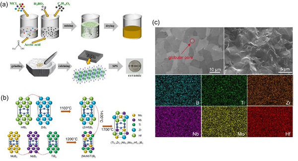 硼化物超高温陶瓷由于其独特的高温热/力学性能,成为极端有氧热环境下服役的理想候选材料。然而,硼化物陶瓷在2500 以上的强氧化流动环境中会发生氧化烧蚀,导致构件失效。解决这一难题的一种有效途径是采用具有较高热发射率的材料,通过热辐射的方式在空间飞行中有效散热,降低构件的温度梯度和热应力使其能够承受更高的热通量,从而提高抗氧化烧蚀性能。此外,由于硼化物陶瓷固有的低损伤容限,在响应热冲击时易于断裂导致失效。高熵硼化物由于其高熵效应而具有优异的力学性能和独特的性能组合,可望解决这些难题。然而,高纯超细高熵硼化物粉体的设计制备、单相固溶机理及热发射率的增强机制仍不明晰;同时,其陶瓷块体的致密化和力学性能的提升也是亟需解决的问题。